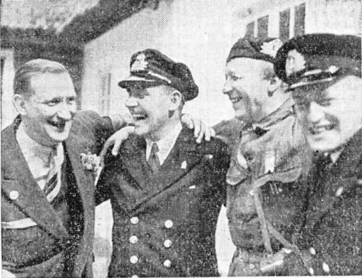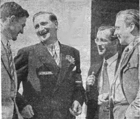 Fra venstre: Grosserer Carl Mogensen, Løjtnant MacDonald Menzies, Kriminalbetjent Kaj Hansen, Sekundløjtnant J.K. Harker. Avisudklip fra Politiken i Carl Mogensen's arkiv.
