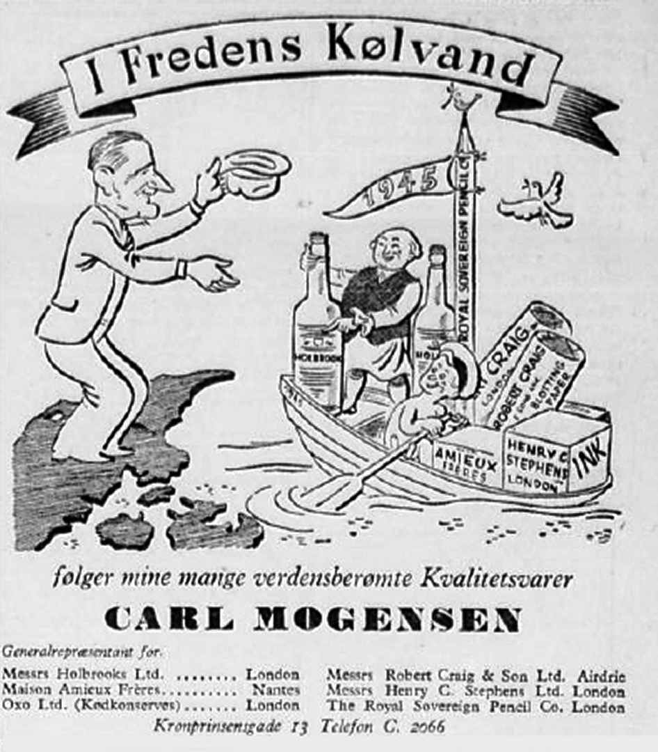 Carl Mogensen troede, at nu blev alt godt og han ville kunne genoptage sine aktiviteter i sit importfirma. Annonce i Politiken 27. juni 1945.