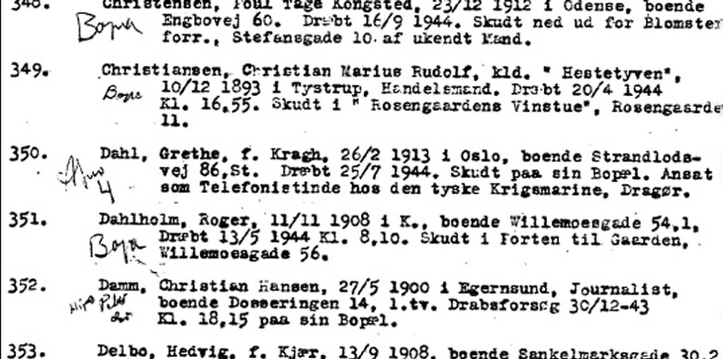 Kort tid efter befrielsen mødte flere modstandsorganisationer på Østerbrogades Kaserne. Her gennemgik man en foreløbig liste med likviderede i årene 1943-45. Som man kan se ud for nr. 349, oplyste BOPA, at det var en af deres likvideringer. Listen blev bl.a. brugt, da man senere evt. skulle udvælge, hvilke likvideringer dansk politi skulle kigge nærmere på. De første ca. 100 af de mere end 400 navne, blev undersøgt, men minister Frode Jakobsen besluttede, at man ikke skulle undersøge videre.