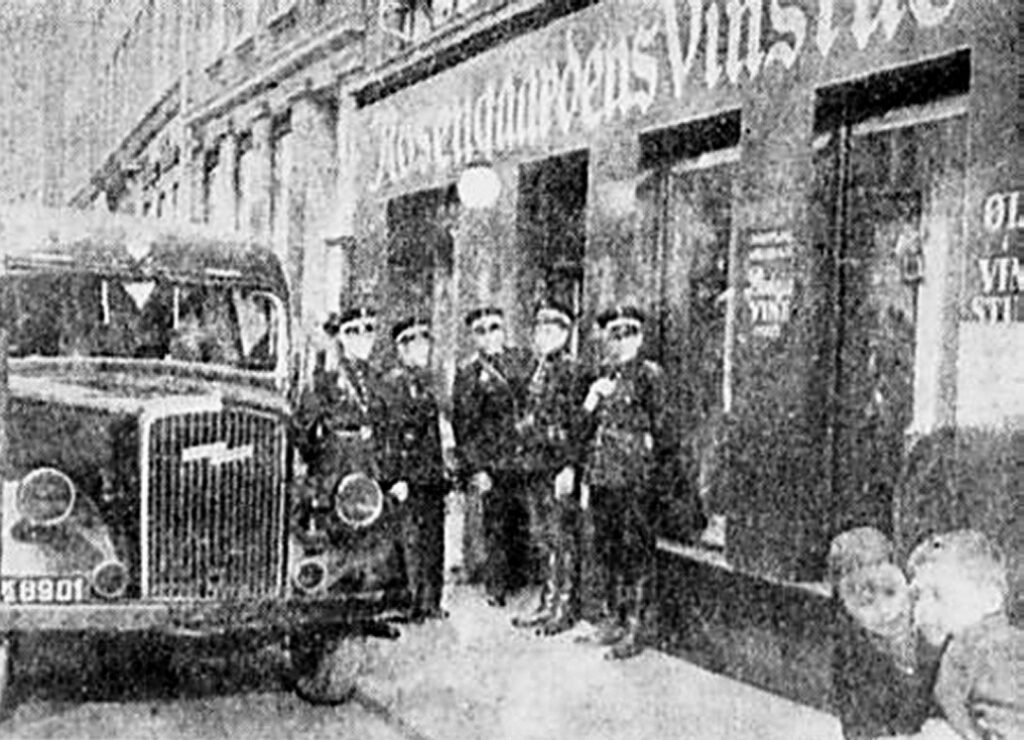 20. april 1944. Foran Rosengårdens Vinstue. Endnu en likvidering. Dansk politi bevogter, medens dansk kriminalpolitiet arbejder inde i vinstuen. Hr. Rudolf Christiansen kendte man ganske godt hos politiet.