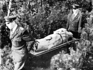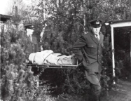 Ambulancefolk fra Falck-Zonen bærer liget af Marie Lock-Hansen ud fra villaen. (Avisfoto).