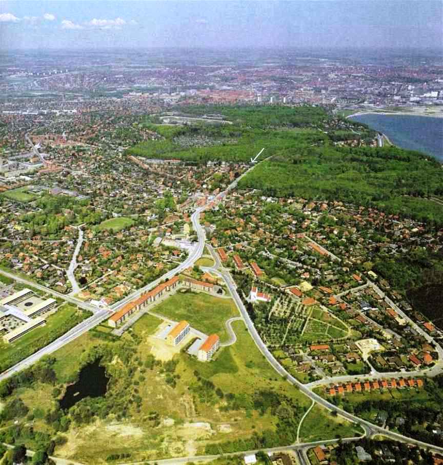 Villaen i Højbjerg, markeret med en lille hvid pil, ligger i sydskellet af "Kirkeskoven". I forgrunden th ligger den kirkegård, hvor Marie Lock-Hansens urnegravsted lå i 10 år.