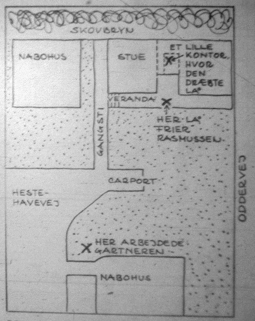 Politiet ville ikke offentliggøre den skitse man havde lavet over parkerede biler i området om formiddagen den 10. november 1967. Her er en skitse fra Århus Stiftstidende af gerningsstedet dagen efter drabet.