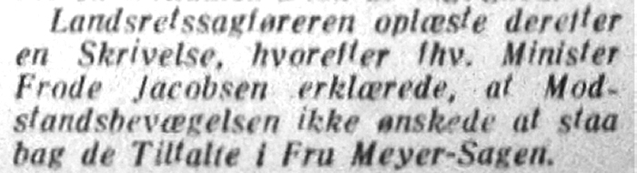 Over for dansk politi bekræftede broderen, der sad i svensk fængsel bl.a. ved årsskiftet 1943-1944, at han havde anbragt fru Meyers taske, noget ammunition og våben i det omtalte skab og at dette var sket "uden søsteren vidende".