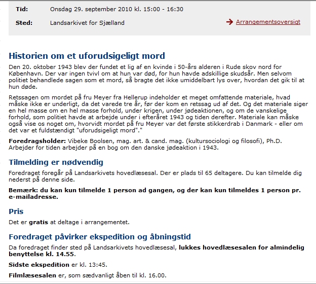 Vibeke Boolsen fortalte om sagen 29. september 2010. Salen på Landsarkivet for Sjælland var fyldt og mange havde forgæves søgt om adgang.