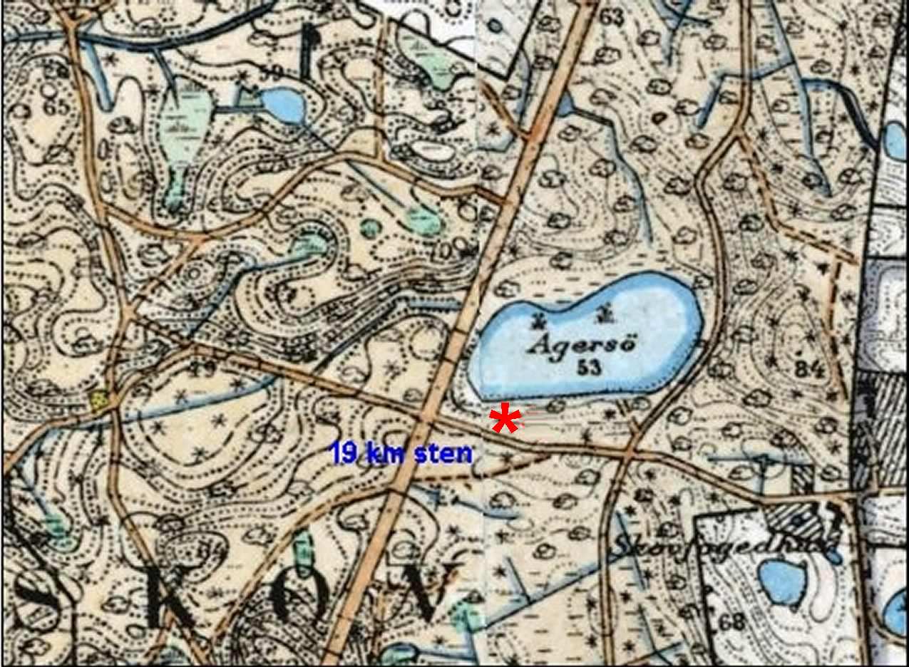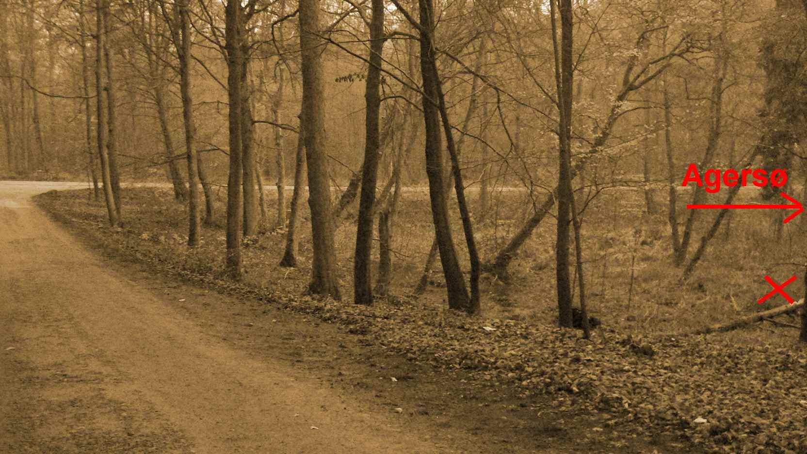 Rude skov. 40 m nede af skovvejen "Bethlehemsvej" og 5 m inde i skoven blev liget fundet.