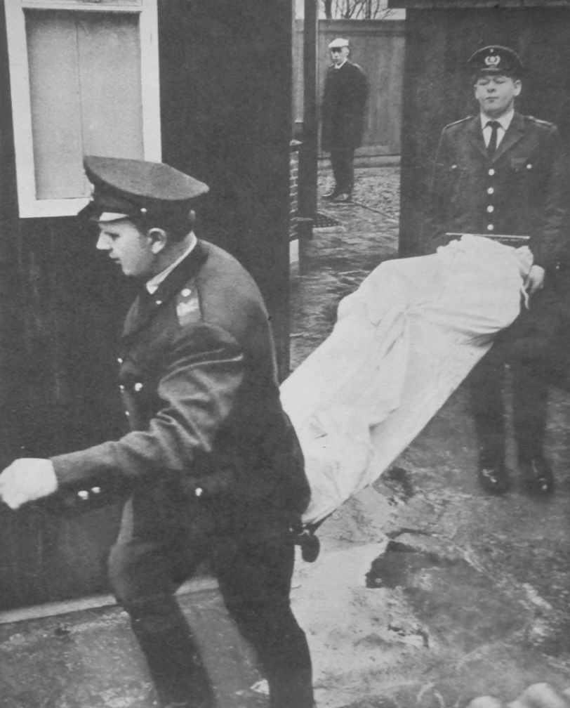 Mandskab fra Falck-Zonen station "Strand", Amager Strandvej bærer liget ud.