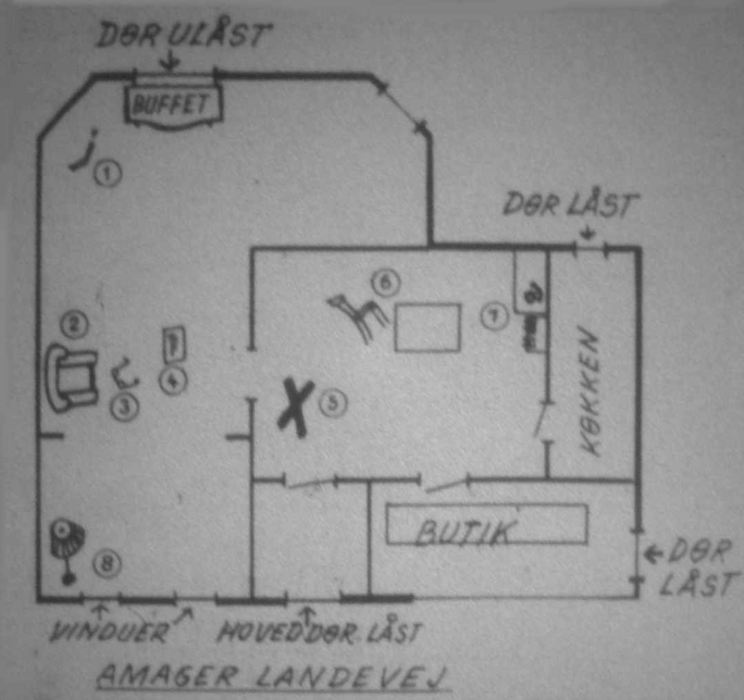 BT's tegning af Amager Landevej 152. Th. En af politiets teknikere står på det sted, hvor man fandt fru Mikkelsen.
