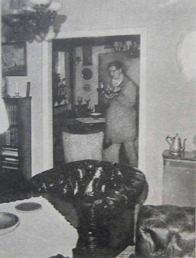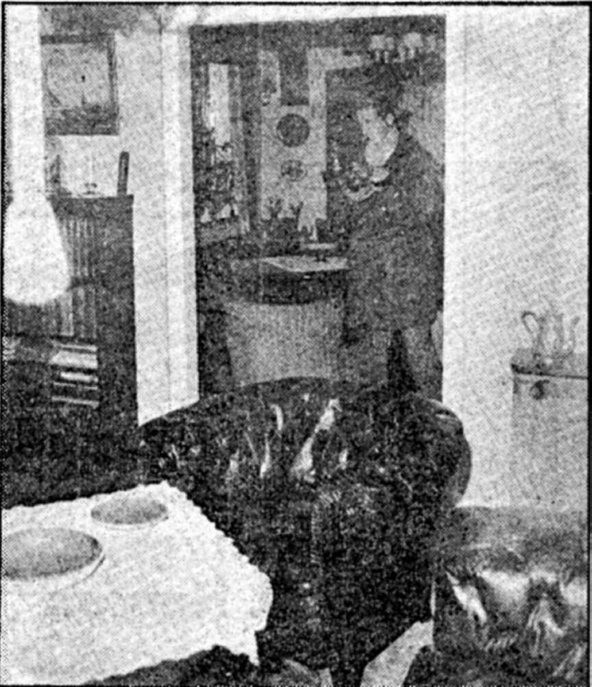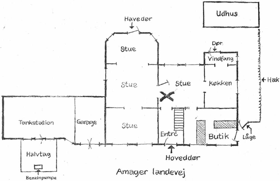 BT's tegning af Amager Landevej 152. Th. En af politiets teknikere står på det sted, hvor man fandt fru Mikkelsen.