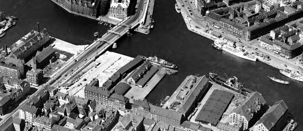 Ca. 1938. Arkitekt Kaj Gottlobs nye Knippelsbro. Den midlertidige Knippelsbro 1934-37 er nedtaget og lagt i depot. Senere genopsat i Falsterbo. Grete Grundtvig boede i Strandgade 23. Ejendommen ligger ved det ryddede areal, hvor husene i Lille Torvegade havde ligget til maj 1938. (Foto: Det Kgl. Bibliotek).